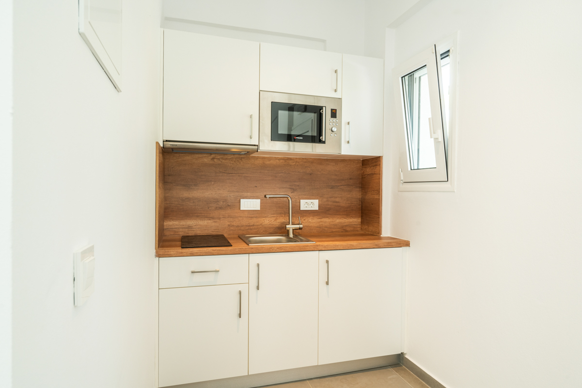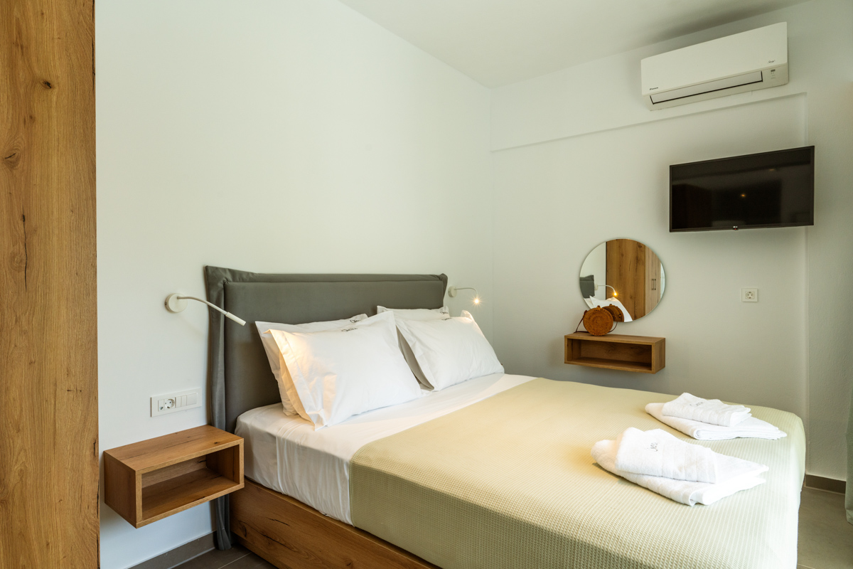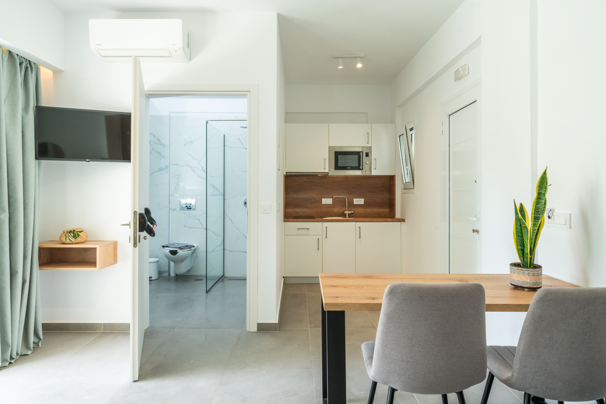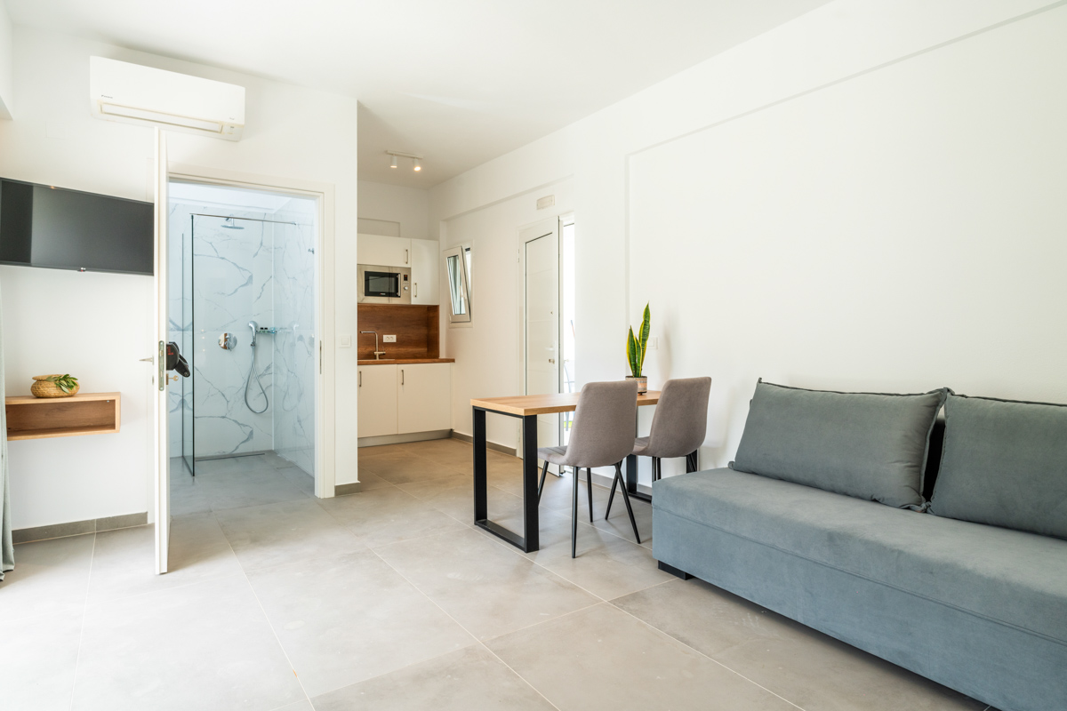 Το όμορφο διαμέρισμα βρίσκεται στο ισόγειο των εγκαταστάσεών μας και προσφέρει όλες τις απαραίτητες παροχές που εξασφαλίζουν την άνετη διαμονή σας στα Omnia Apartments. Αποτελείται από δύο ξεχωριστούς χώρους, μία κρεβατοκάμαρα που ενωνεται με την πλήρως εξοπλισμένη κουζίνα και ένα όμορφο μπάνιο. Επιπλέον στον χώρο θα βρείτε και έναν ευρύχωρο καναπέ που μετατρέπεται εύκολα σε άνετο διπλο κρεβάτι. Αυτός είναι ο λόγος που μπορεί να φiλοξενήσει με άνεση, από ζευγάρια έως οικογένειες με 2 παιδιά. Στο ευρύχωρο μπαλκόνι μπορείτε να καθίσετε και να χαλαρώσετε, απολαμβάνοντας το πράσινο και την ησυχία της περιοχής, με την συνοδεία ενός δροσιστικού ποτού ή αναψυκτικού. Τέλος, αξίζει να σημειωθεί ότι το διαμέρισμα είναι κατάλληλο για ανθρώπους με ειδικές ανάγκες.