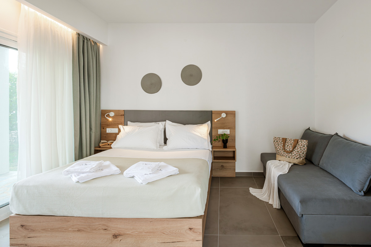 Το όμορφο διαμέρισμα βρίσκεται στο ισόγειο των εγκαταστάσεών μας και προσφέρει όλες τις απαραίτητες παροχές που εξασφαλίζουν την άνετη διαμονή σας στα Omnia Apartments. Αποτελείται από δύο ξεχωριστούς χώρους, μία κρεβατοκάμαρα που ενωνεται με την πλήρως εξοπλισμένη κουζίνα και ένα όμορφο μπάνιο. Επιπλέον στον χώρο θα βρείτε και έναν ευρύχωρο καναπέ που μετατρέπεται εύκολα σε άνετο διπλο κρεβάτι. Αυτός είναι ο λόγος που μπορεί να φiλοξενήσει με άνεση, από ζευγάρια έως οικογένειες με 2 παιδιά. Τέλος, στο ευρύχωρο μπαλκόνι μπορείτε να καθίσετε και να χαλαρώσετε, απολαμβάνοντας το πράσινο και την ησυχία της περιοχής, με την συνοδεία ενός δροσιστικού ποτού ή αναψυκτικού.